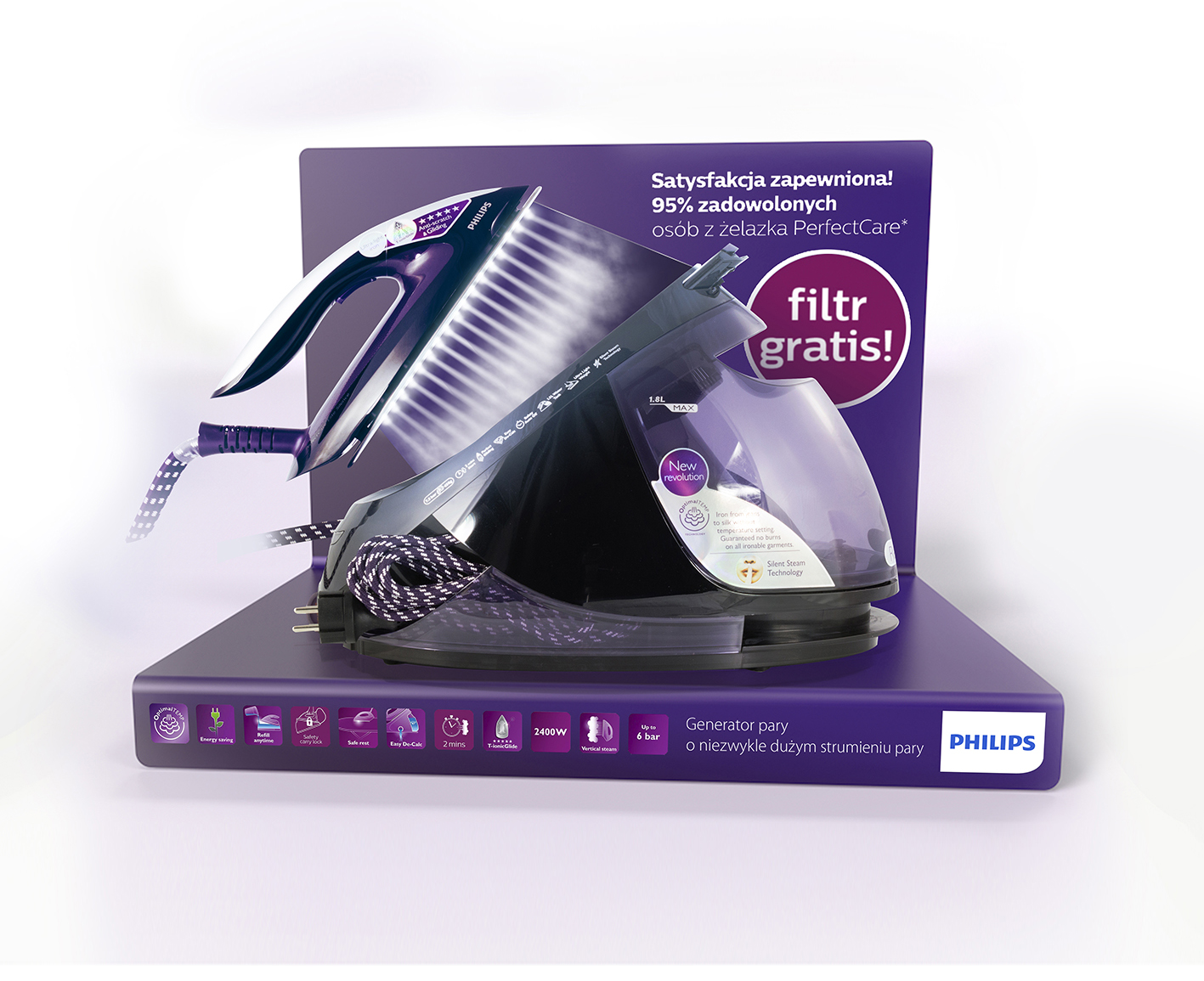 Interaktywny napółkowy POS z plexi z czujnikiem zbliżeniowym. Gdy klient podejdzie, uruchamia się podświetlany efekt pary i dźwięk syku — obrazując technologię Philips Steam.